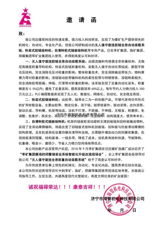 本產(chǎn)品一經(jīng)推出即獲得各大設(shè)計(jì)院及用戶(hù)的一致好評(píng),率先在棗礦集團(tuán)岱莊煤礦取得成功應(yīng)用,2018年9月受邀參加了《棗礦集團(tuán)煤場(chǎng)封閉暨儲(chǔ)裝運(yùn)系統(tǒng)智能化升級(jí)改造現(xiàn)場(chǎng)會(huì)》,智能裝車(chē)系統(tǒng)得到了充分肯定!我司憑借雄厚的加工制造實(shí)力及過(guò)硬的創(chuàng)新技術(shù)能力,勢(shì)必為運(yùn)輸稱(chēng)重系統(tǒng)、快速計(jì)量裝車(chē)系統(tǒng)帶來(lái)又一次的技術(shù)創(chuàng)新變革。